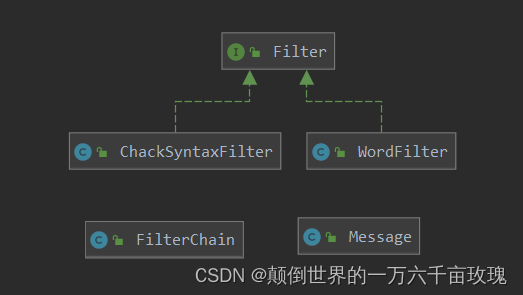 web容器中的过滤器算是责任链模式的一个经典场景。另外举个例子:当在论坛上提交内容时,论坛系统需要对一些关键词进行处理,看看有没有包含一些敏感词汇,而这些敏感词汇我们可以使用责任链模式进行处理。