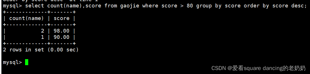 2.3 结合where语句,筛选分数大于等于80的分组,计算学生个数 select count(name),score from gaojie where score > 80 group by score;