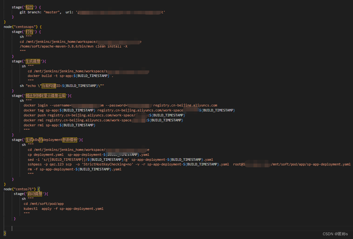 生成k8s的deployment参数模板:依据项目中提前写好的deployment.yaml模板进行生成自己项目的deployment.yaml。【先复制出来一个deployment.yaml,通过sed进行模板中的镜像版本号进行替换】,替换成功后推送deployment.yaml到集群的主节点。