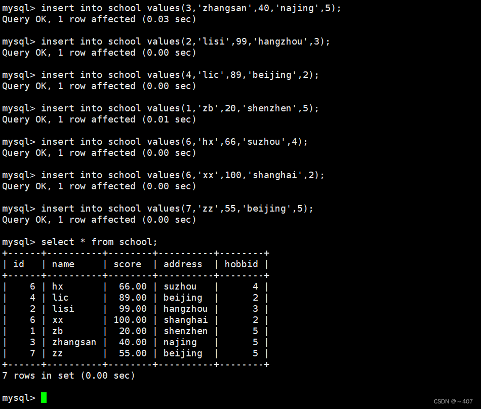 - 创建了一个新表, 并定义表结构,插入表数据(与school表相同)