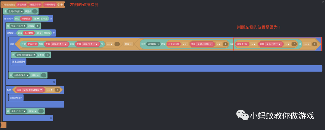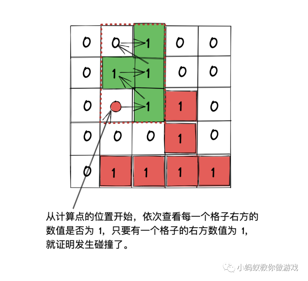关于什么是计算点,如何获取计算点在数据表格中的行列位置,以及如何遍历当前图形的数据,我们在上一节中已经详细讲过了,这里就不再赘述了。总之,我们从计算点的位置开始,依次的遍历形状上的每一个格子位置,只要有任何一个格子左/右方的数值为 1 ,就证明发生“碰撞”了。