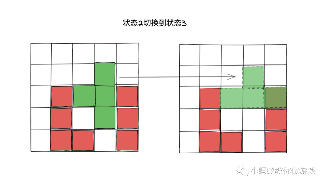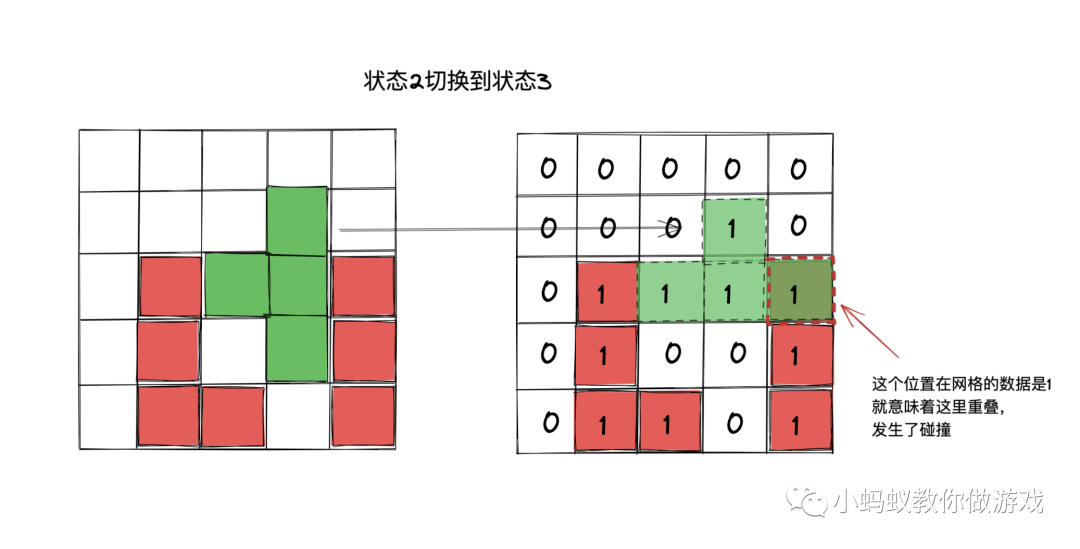 “形状1”由状态 2 切换到状态 3 时,右侧的方块会覆盖在已有的红色方块上,此时就发生了“碰撞”。在游戏中这种情况是不允许发生的,也就是说,我们需要预先判断将要切换的状态是否会与已有的方块发生“碰撞”,如果是的话,就不允许当前的形状切换状态。