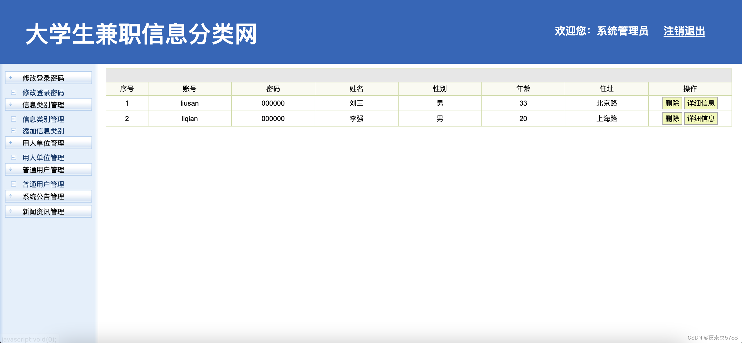 这个项目是一个基于Struts2+Spring+MyBatis的大学生兼职管理系统,分为管理员和企业用户和普通用户三种角色。
