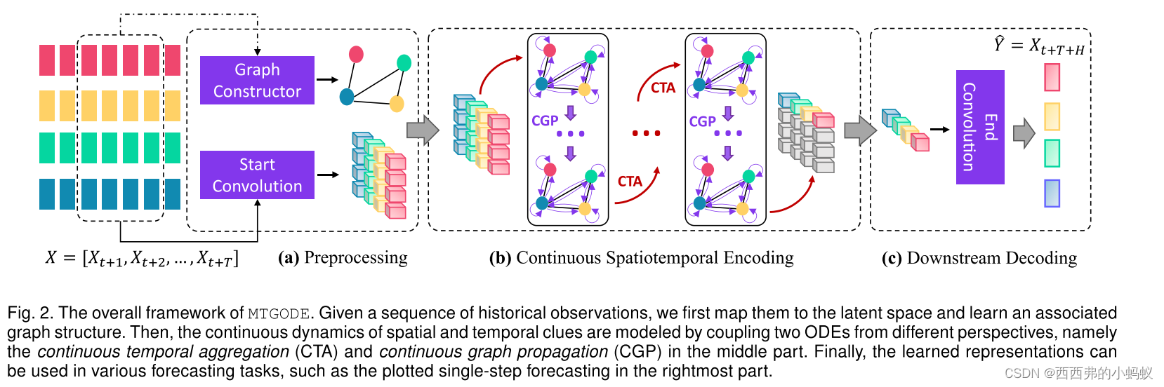 为了有效地提取和聚合细粒度的时间模式,我们用提出的CTA进程替代离散时间卷积,它不仅以连续的方式对底层复杂的时间动态建模,而且还解开聚合深度和内存瓶颈之间的联系。在MTGODE中,提出的连续空间和时间消息传递机制被优雅地统一起来,并由单一的ODE描述。这样,我们的方法可以通过简单求解此ODE,以完全连续的方式对任意多元时间序列的复杂潜在时空动力学进行有效建模。