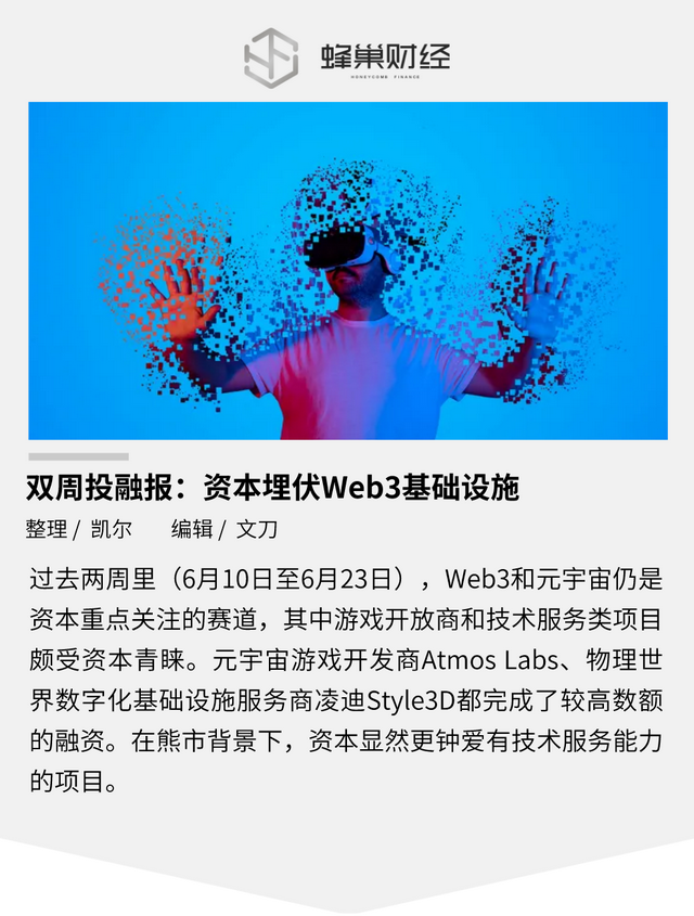 元宇宙游戏仍是资本抢滩赛道。元宇宙游戏开发商Atmos Labs完成1100万美元种子轮融资,a16z领投了区块链游戏公司Clockwork Labs的2200万美元A轮融资。此外,还有多家游戏开发制作公司完成早期融资。
