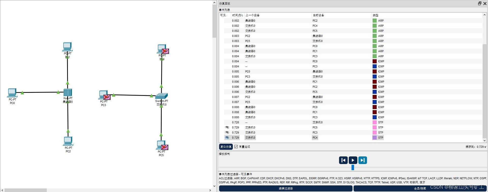 PC0与PC3分别将ARP广播报文发送至集线器与交换机