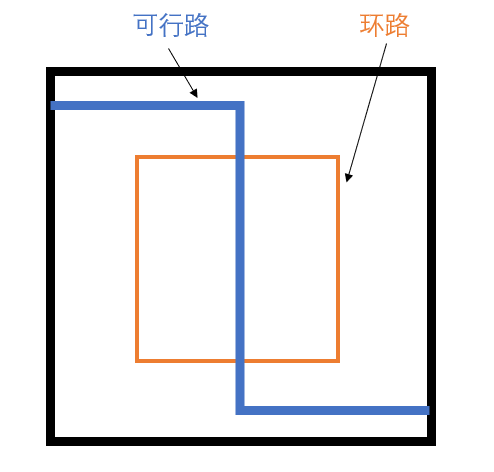 当然我并没有全部照搬,只是采用了深度优先的思想。因为这几种生成算法都只能产生一条可行路径。为了体现遍历和寻优,我直接在迷宫中生成了一条大小合适的环路,并控制生成迷宫的复杂程度,这样一般情况下迷宫会有多条可行路径,示意图如下: