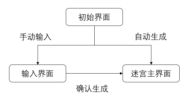 回想我们要实现的功能,手动或自动生成迷宫地图,自动的上面算法已经实现,手动的就需要绘制界面供我们输入。顺着这个思路,我们可以先设计一下交互逻辑,进而确定需要哪些界面,每个界面又对应哪些功能,我的设计方案如下: