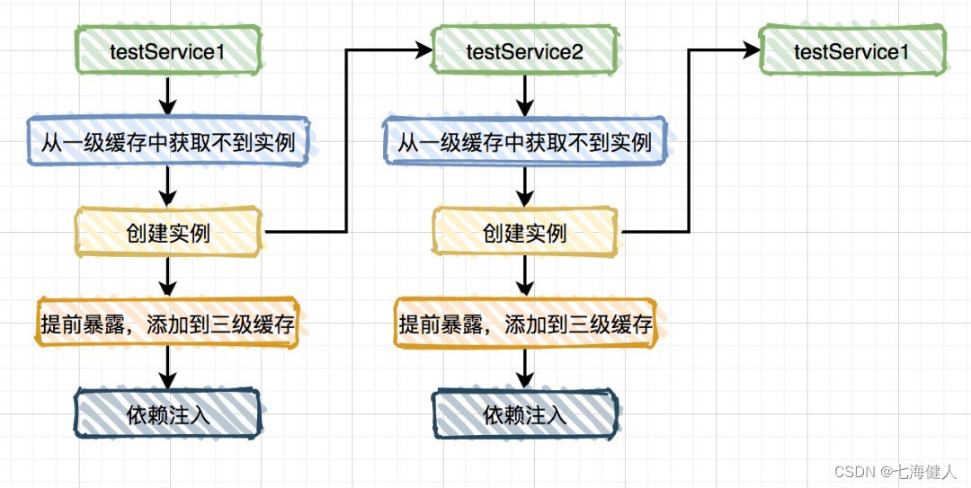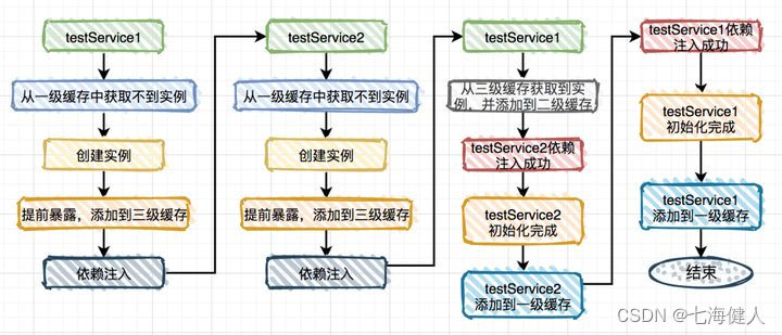 Spring通过三级缓存解决了循环依赖,TestService1与TestService2互相依赖,流程如下: