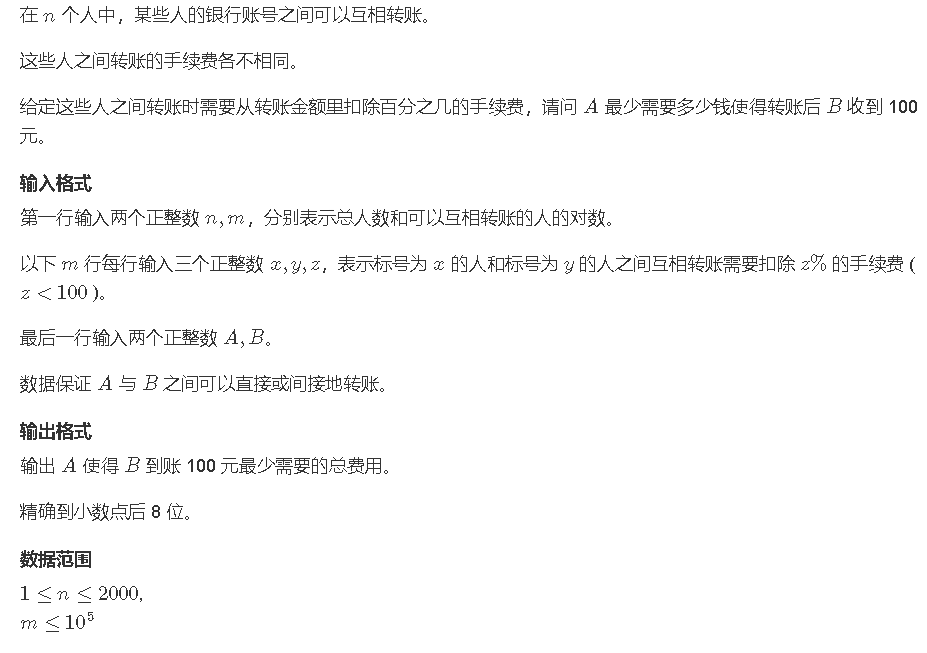 思路:,将转账看成是在图上走过一条边,这条边的权是1 − z % ,并且每走过一条边,就乘上这个权值。那么相当于要问,从A 走到B 的最大权值乘积是多少。