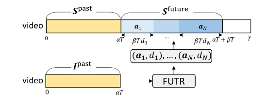 长期行动预测的问题是从视频的给定可观察部分预测未来视频帧的动作序列。图2说明了问题设置。对于具有T帧的视频,观察到第一个αT帧,并预期下一个βT帧的动作序列;α 是视频的观察率,而β是预测比率。
