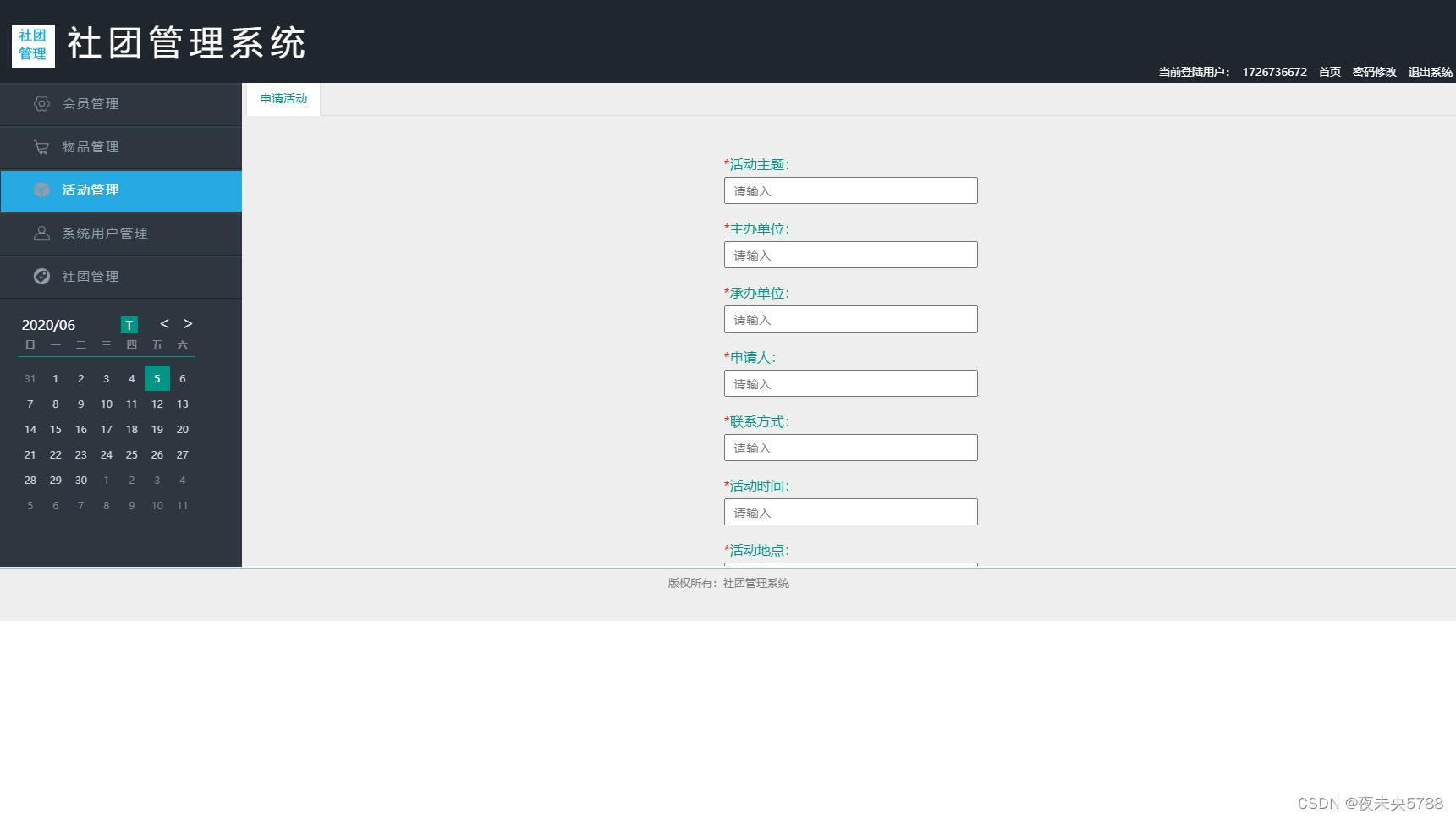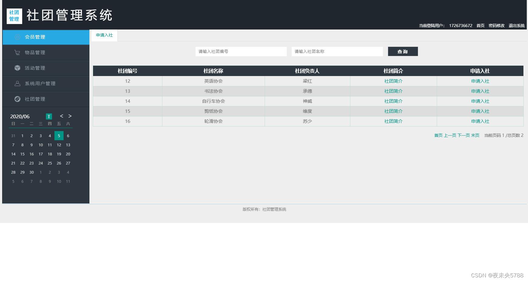 会员管理,物品管理,活动审批,系统用户管理,社团添加删除等功能。