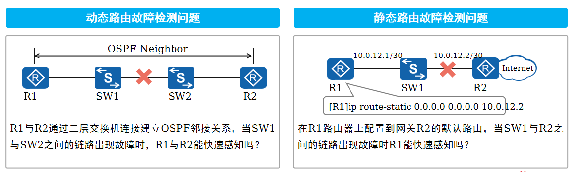 静态路由自身没有检测机制,如果静态路由存在冗余路径,通过静态路由与BFD联动,当主用路径故障时,实现静态路由的快速切换 。