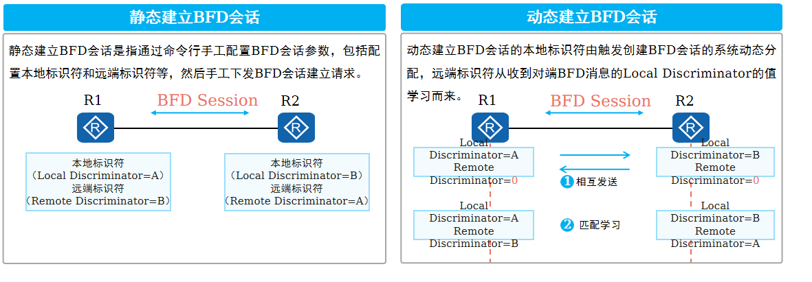 BFD会话的建立有两种方式,即静态建立BFD会话和动态建立BFD会话。BFD通过控制报文中的本地标识符和远端标识符区分不同的会话。静态和动态创建BFD会话的主要区别在于Local Discriminator和Remote Discriminator的配置方式不同。