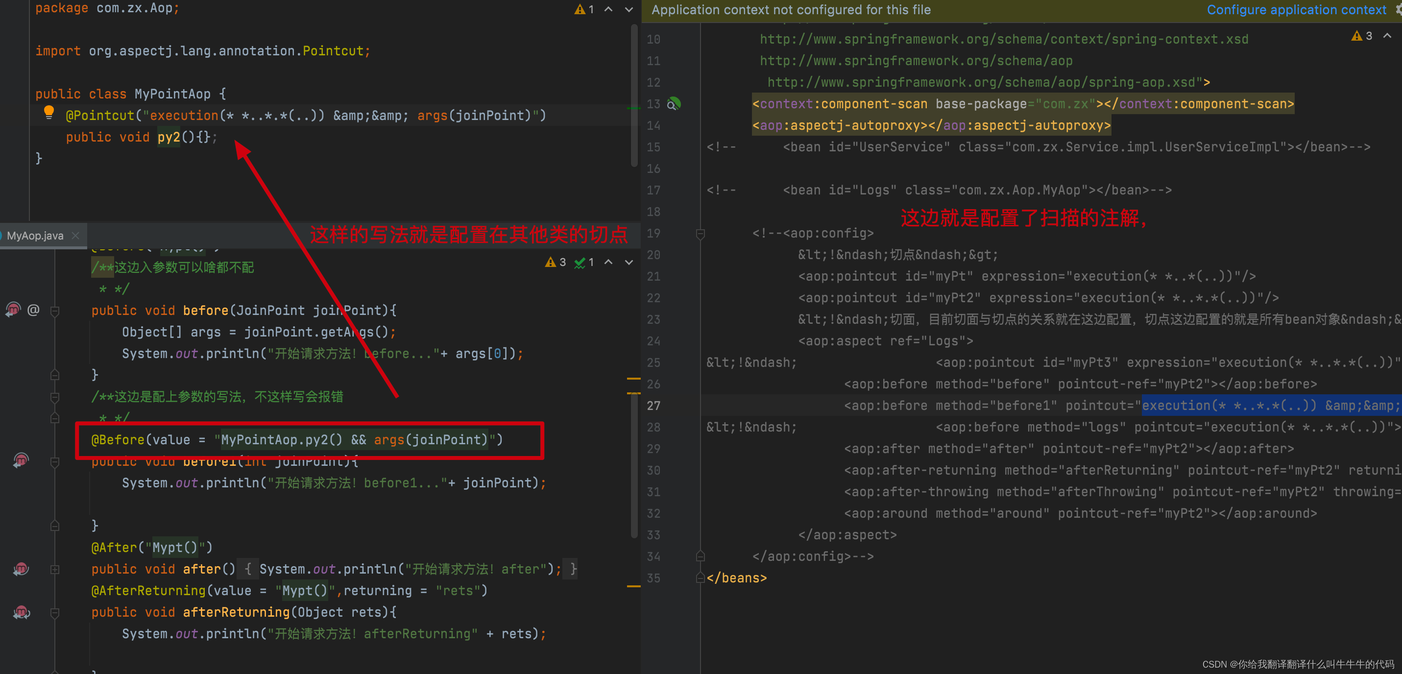 - <aop:before method="logs" pointcut-ref="myPt"></aop:before>