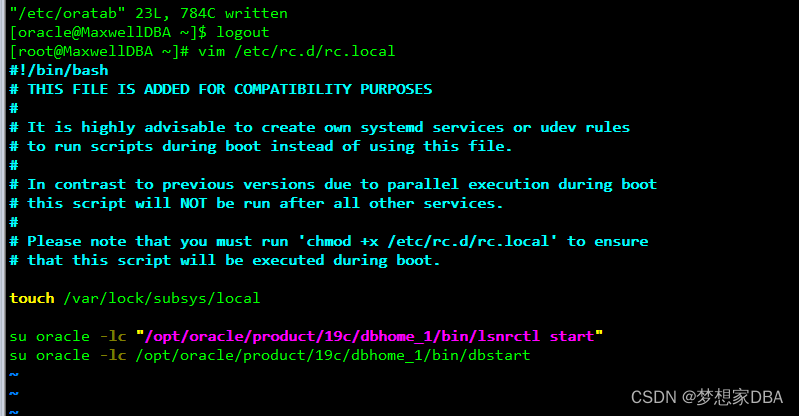 2、 root用户操作,修改centos系统启动脚本: vim /etc/rc.d/rc.local 在最后加入以下两行: 启动监听:su oracle -lc "/opt/oracle/product/19c/dbhome_1/bin/lsnrctl start" 这句要加引号是因为“lsnrctl start”之间有空格 启动数据库:su oracle -lc /opt/oracle/product/19c/dbhome_1/bin/dbstart