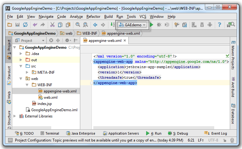 - 将创建的应用程序的名称添加到appengine-web.xml文件。