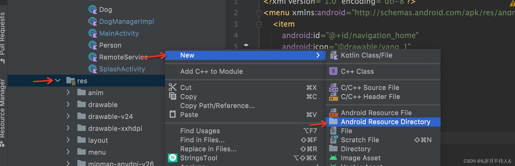 它是在menu文件下新增nav_menu布局,如何新建呢?看图
