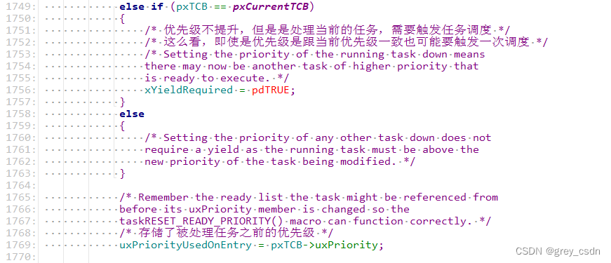 待修改任务的当前基础优先级不等于需要修改的优先级的时候才有修改的需要,如果修改又会分为优先级提升和优先级降低两个可能。因为优先级的提升可能会高过当前正在运行的任务的优先级,这样的话就需要一个任务的切换。但是,高于当前正在运行的优先级又会有两种可能。要么是其他的任务要高于当前的任务,要么是当前任务本身需要提升优先级。针对后者,其实当前任务已经是最高优先级的就绪任务了,那么也就没有了 调度切换的需要了。