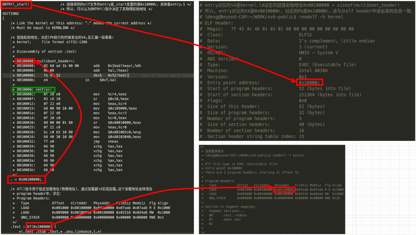 (2)链接脚本中. = 0x80100000指定的是链接地址(VA),在开启分页机制后,PC指针就按照这个地址去取指令;