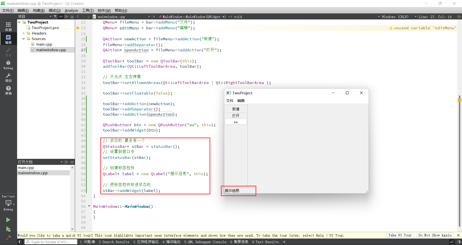 - QStatusBar* stBar = statusBar();