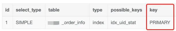 可以看到它的 possible_keys(此 SQL 可能涉及到的索引) 是 idx_uid_stat,但实际上(key)用的却是全表扫描