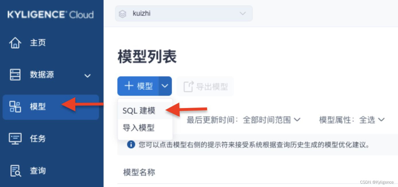 5. 在左侧导航栏,选择模型 > SQL 建模。