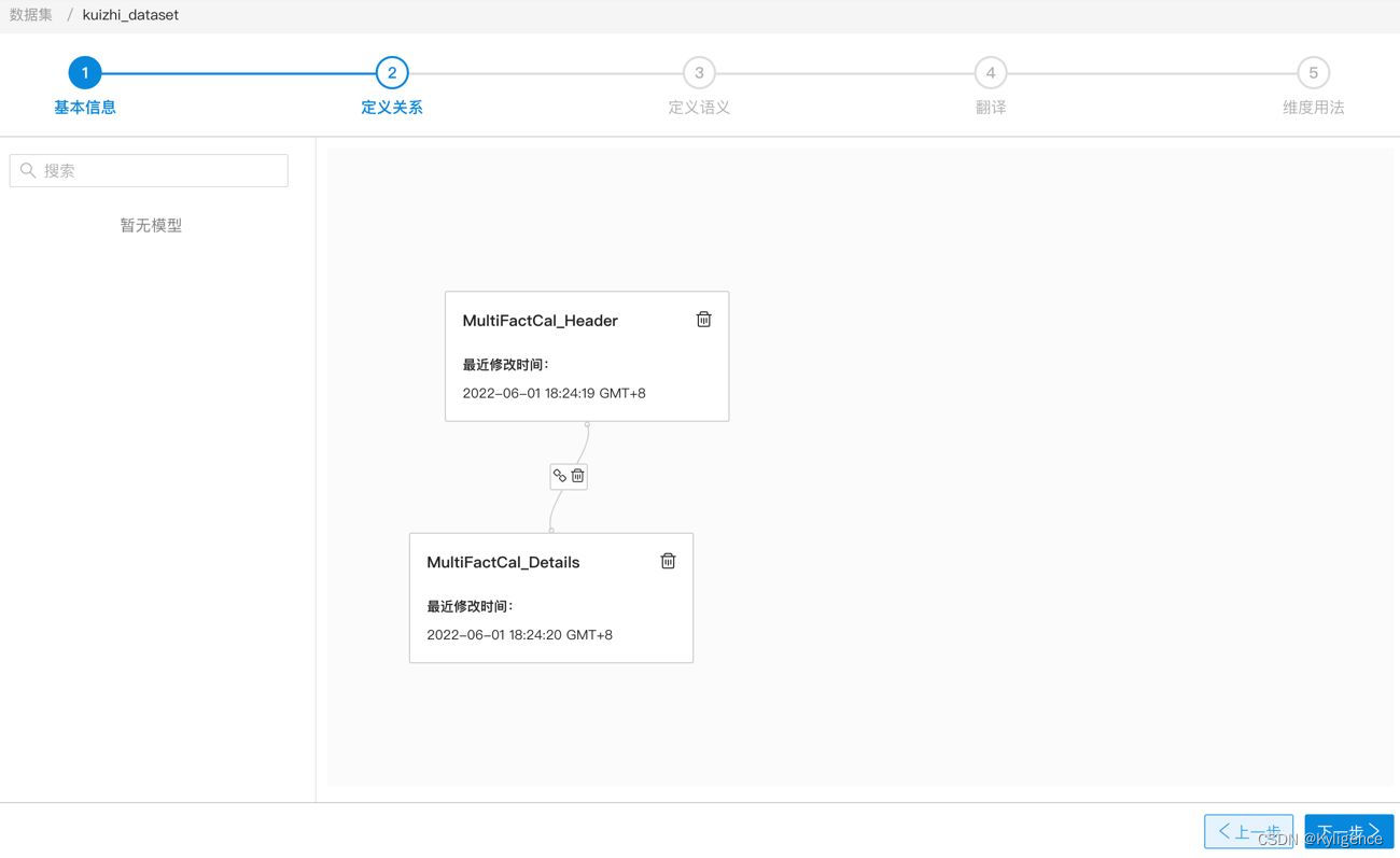 2. 在定义关系页面,定义模型的关系:将 Kyligence Test Drive 中创建的两个模型 MultiFactCal_Header 和 MultiFactCal_Details 通过拖拽添加为关联星座模型,用时间维表 Dim_Simple_Date 作为公共维表。