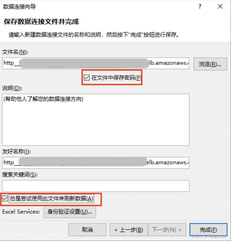 5. 勾选在文件中保存密码并勾选总是尝试使用此文件来刷新数据,点击完成。 现在我们可以在 Excel 里进行数据分析了。