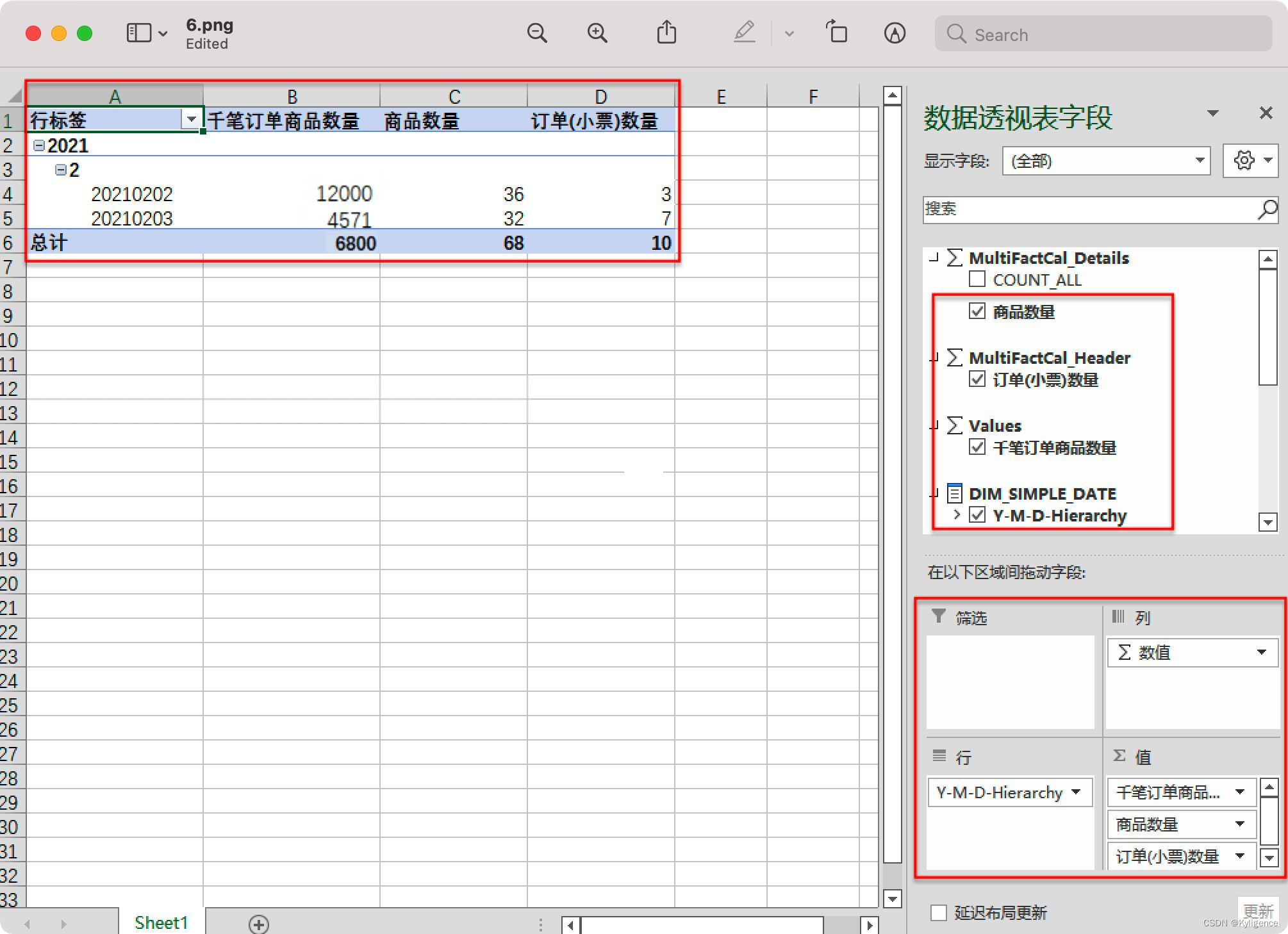 7. 在打开的数据透视表上进行字段的设置:设置行为 Y-M-D 日期层级结构;设置值为千笔订单商品数量,商品数量和订单(小票)数量。