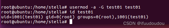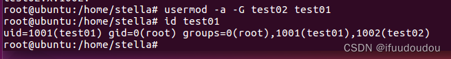 通过usermod -g root test01就把test01这个用户给移动到root这个组了。