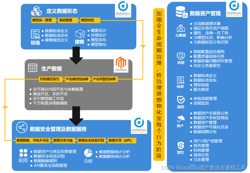 通过了解数据资产管理与数据安全国内外最新趋势,我们不难发现数据模型管控解决方案对数据资产全生命周期的管理行之有效。作为数据资产管理的先锋企业,Datablau创新数据治理模式,自主研发DAM数据资产管理平台和数据安全管理平台。
