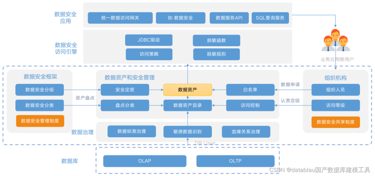下图是Datablau在很多金融行业落地的解决方案。底层是数据资产,通过人-数-安全三维一体的方式进行数据安全的管理。才能达到RBAC/ABAC的粒度进行数据安全管理。
