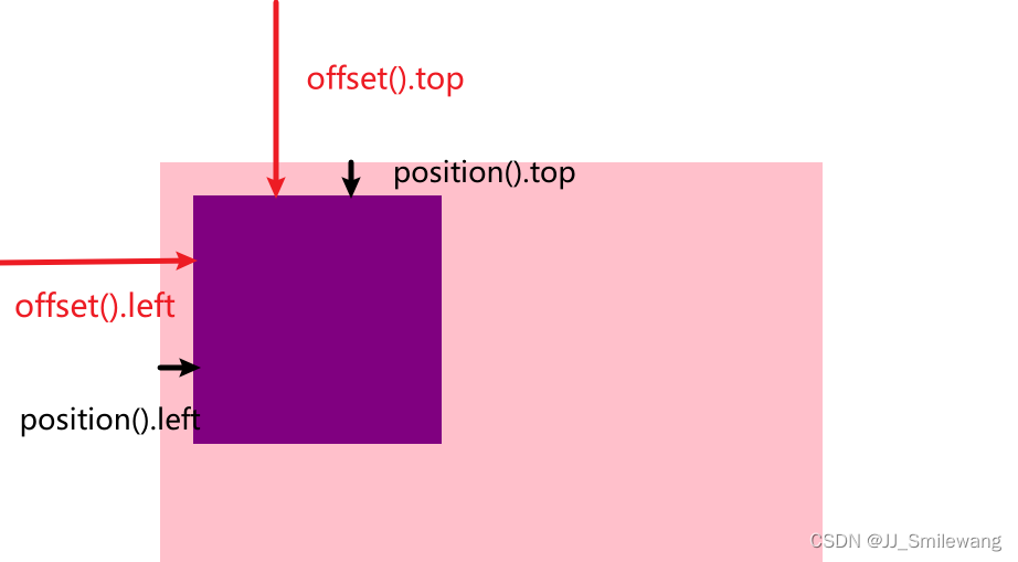<!-- 引入 jQuery 文件 --> <script src="https://cdn.bootcdn.net/ajax/libs/jquery/3.6.0/jquery.js"></script> <!-- css样式 --> <style> * { margin: 0; padding: 0; } .father { position: relative; width: 400px; height: 400px; margin: 100px; background-color: pink; overflow: hidden; } .son { position: absolute; top: 20px; left: 20px; width: 150px; height: 150px; background-color: purple; } </style> <body> <!-- HTML结构 --> <div class="father"> <div class="son"></div> </div> <!-- js 代码 --> <script> $(function() { // 1. 获取设置距离★★文档的位置(偏移) offset() 无参为获取,有参为修改设置 console.log($(".son").offset()); // 得到的是一个对象,里面包含属性top和left console.log($(".son").offset().top); // 得到属性top的值 // 设置偏移时,以对象形式传参 /* $(".son").offset({ top: 200, left: 200 }) */ // 2. position获取距离带有定位父级的位置(偏移),如果没有带有定位的父级,则以文档为准 // ★★position() 只能获取,不可设置 console.log($(".son").position()); }) </script> </body>