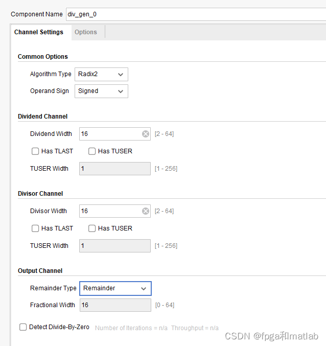 假设输入的除数和被除数数据均为16位宽,所以参数配置如下: