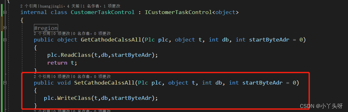 5.2 接着,我们实现这个泛型接口,那么这个t,我们就可以换成,我们跟Plc定义的数据块,建立的对应实体类了。例如,当前Plc有一个db块5,我们建立对应的实体属性类名是CathodeEntity,我们调用的时候就传CathodeEntity 实体进来。如果plc 有多个db块,我们也要有多个对应的实体类。这个时候我们就可以把不同的实体类传进去,返回来就是plc 具体db块的值了。
