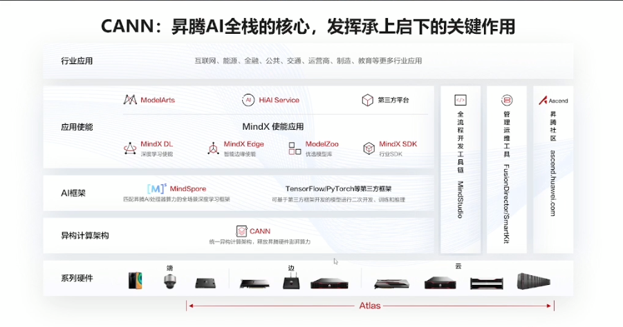 Ascend 310是硬件,我们是基于在硬件上构建的软件进行开发的,不会直接接触到底层的硬件,这里我们是基于CANN开发,CANN(Compute Architecture for Neural Networks)是华为公司针对AI场景推出的异构计算架构,通过提供多层次的编程接口,支持用户快速构建基于昇腾平台的AI应用和业务。包括: