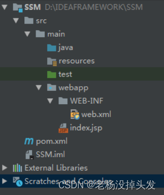 这样就创建好了一个名称为SSM的maven web项目,结构如下图: