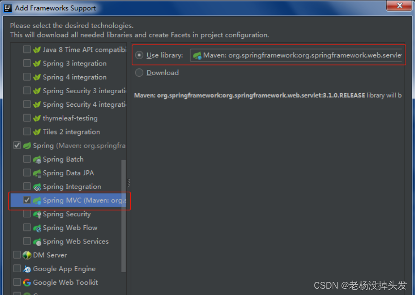 注意:如果我们在点击Add framework support中找不到Spring,那么有可能项目中已经存在了Spring文件,但不一定是完善的,我们只需要把它删除然后重新添加即可