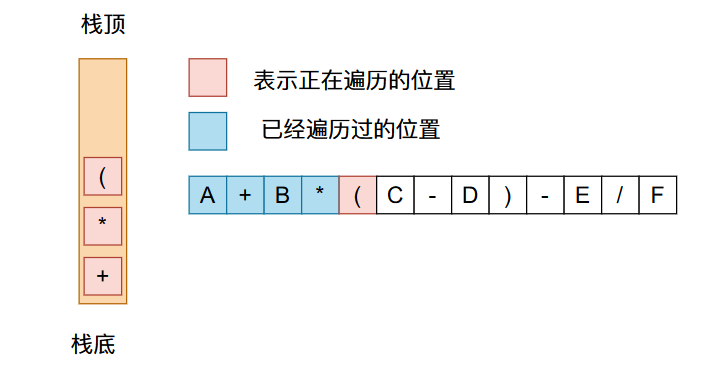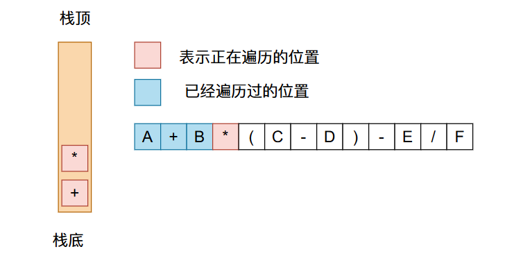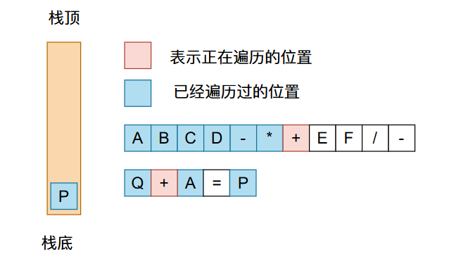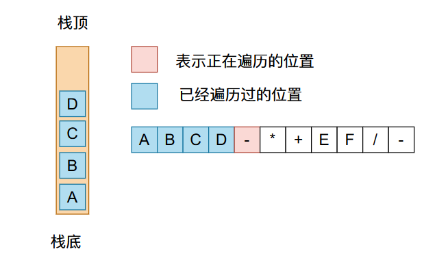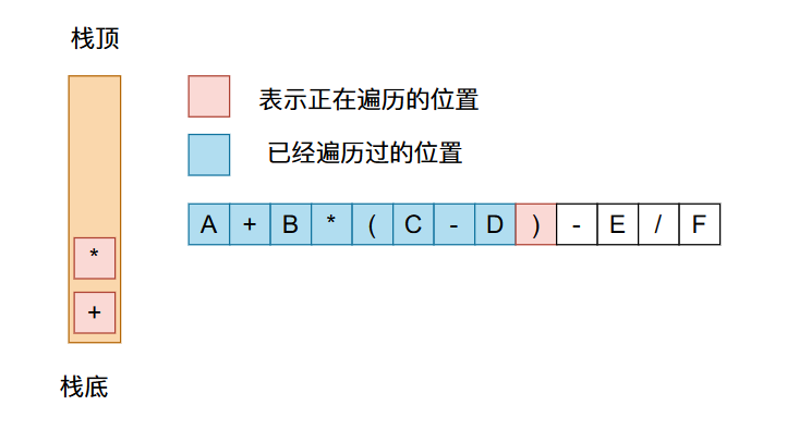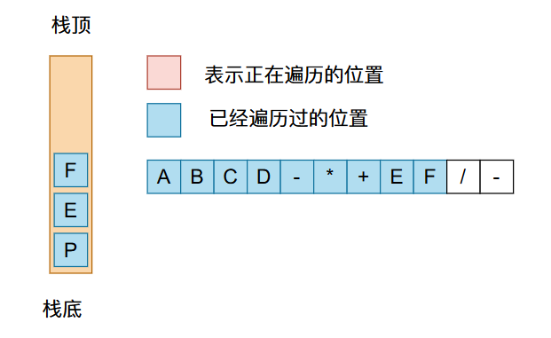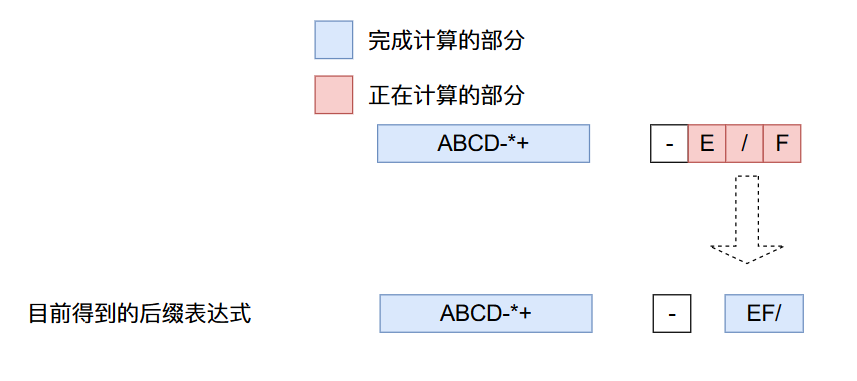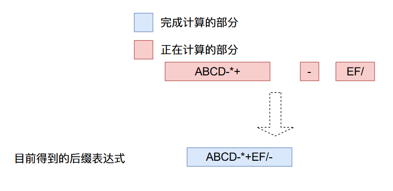 ,需要将栈中优先级大于等于 的运算符弹出,则当前的后缀表达式为 ,再将 压入栈中。