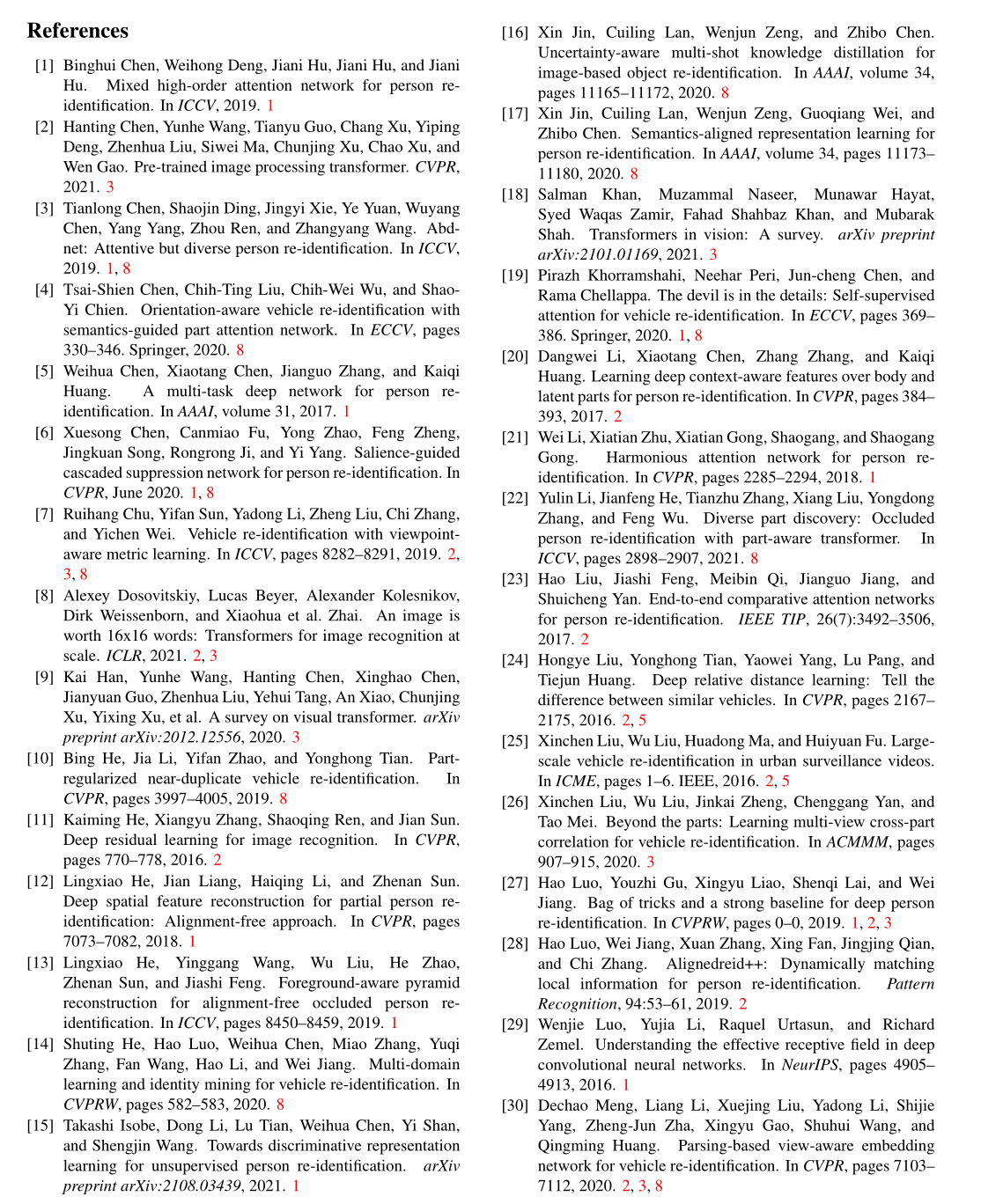 目标重识别 (ReID) 旨在将特定目标关联到不同的场景和相机视角中,例如在行人 ReID 和车辆 ReID 的应用中。提取鲁棒和判别特征是 ReID 的关键组成部分,并且长期以来一直由基于 CNN 的方法主导 [19、37、36、44、42、5、12、13、53、15]。
