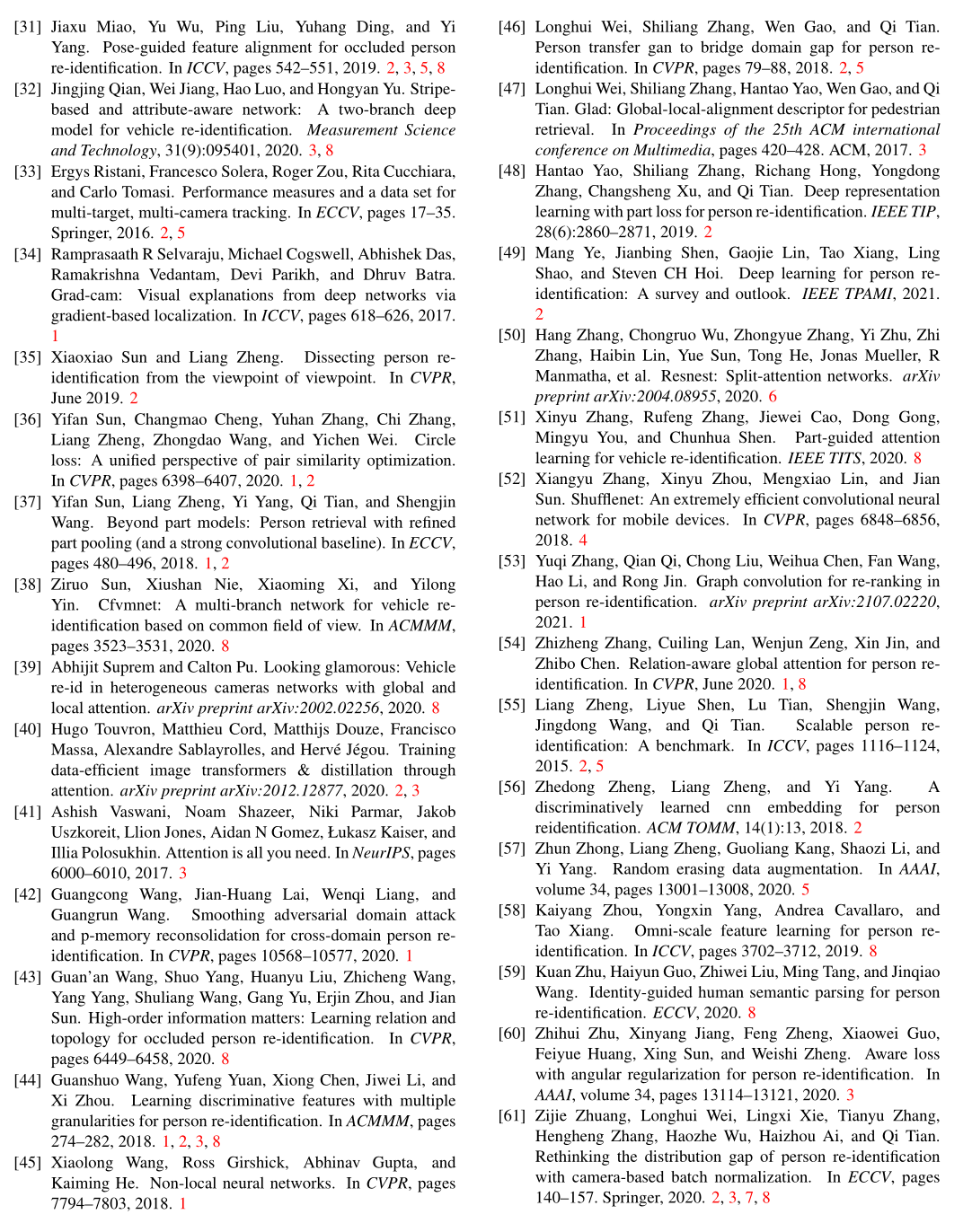 侧面信息。对于在交叉摄像头系统中捕获的图像,由于不同的摄像头设置和对象视角,在姿势、方向、照明、分辨率等方面存在很大的变化。一些工作 [61, 7] 使用诸如相机 ID 或视角信息等辅助信息来学习不变特征。例如,基于相机的批量归一化(CBN)[61] 强制将来自不同相机的图像数据投影到相同的子空间上,从而大大缩小相机间和相机内对之间的分布差距。Viewpoint/Orientation-invariant 特征学习 [7, 60] 对于行人和车辆 ReID 也很重要。