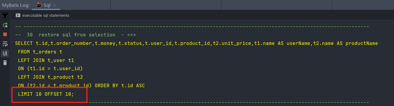 注意在这里需要添加一个分页参数的Page对象,我们再执行上面的代码,并对日志进行解析,查看sql语句: