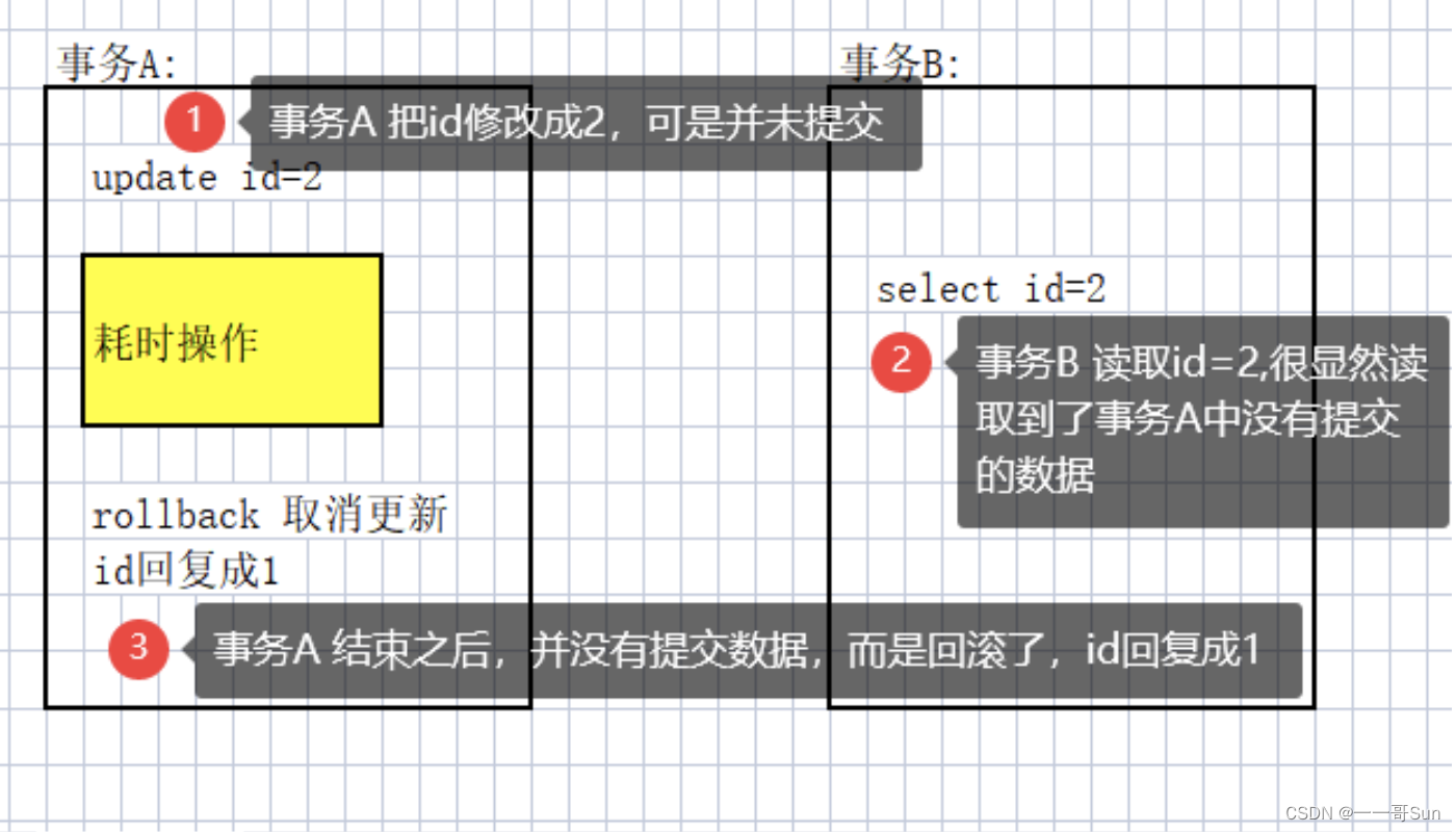 脏读:实际上就是在一个事务中读取到了另外一个事务还没有提交的数据,如下图所示: