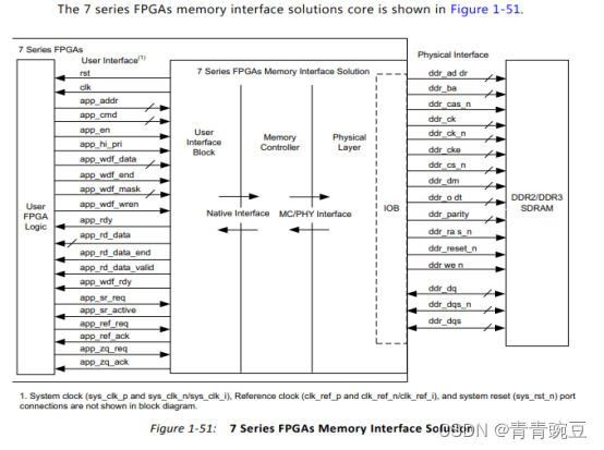 如图4所示是XILINX 7系列的MIG IP核内部结构框图,其中集成存储器控制模块,实现DDR读写操作的控制流程,大家可以看到MIG IP核对外又划分出了两组接口:左侧是用户接口,即用户侧所编写的代码与MIG IP核交互接口,而右侧为DDR物理芯片接口,负责产生具体的操作时序,并直接操作芯片管脚,以达到硬件上控制DDR3颗粒读写的效果。
