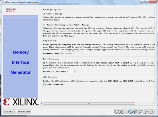 如图14所示是MIG IP核顶层配置界面,直接选择“Create Design”,并在“Component Name”一栏设置该IP元件的名称,这里取默认软件的名称即可,选择控制器数量,默认为“1”,最后关于AXI4接口,因为大部分工程中并不使用,所以默认情况下都不勾选。