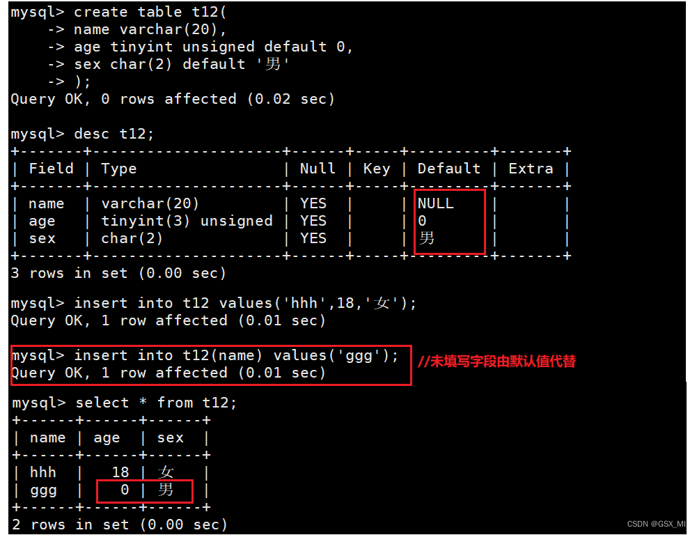 - 只有设置了default的列,才可以在插入值的时候,对列进行省略