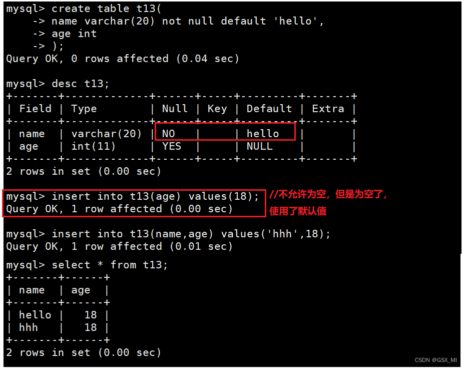 - 如果设置了default,再设置not null,但是绝对不推荐! 毫无意义!