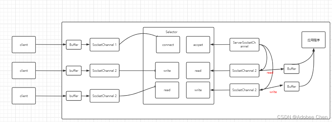 - Selector能够检测多个注册的通道上是否有事件发生(注意:多个Channel以事件的方式可以注册到同一个Selector),如果有事件发生,便获取事件然后针对每个事件进行相应的处理,这样就可以只用一个单线程区去管理多个通道,也就是管理多个来连接和请求。