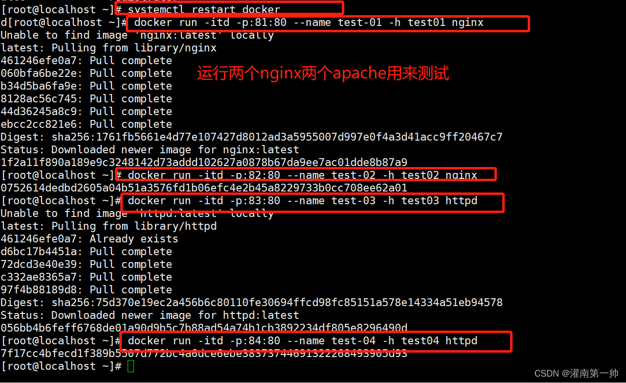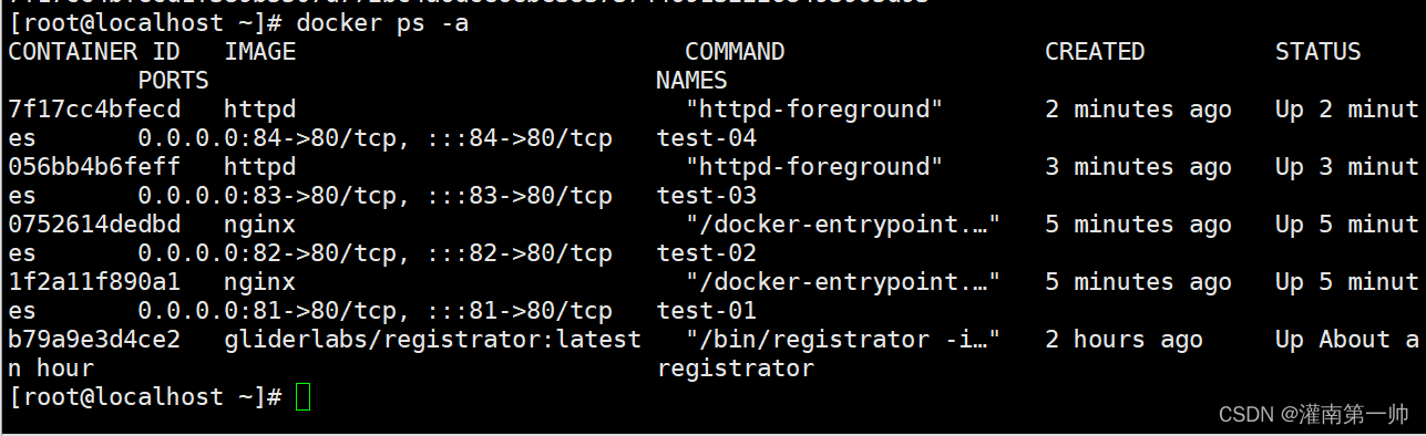 - docker run -itd -p:84:80 --name test-04 -h test04 httpd